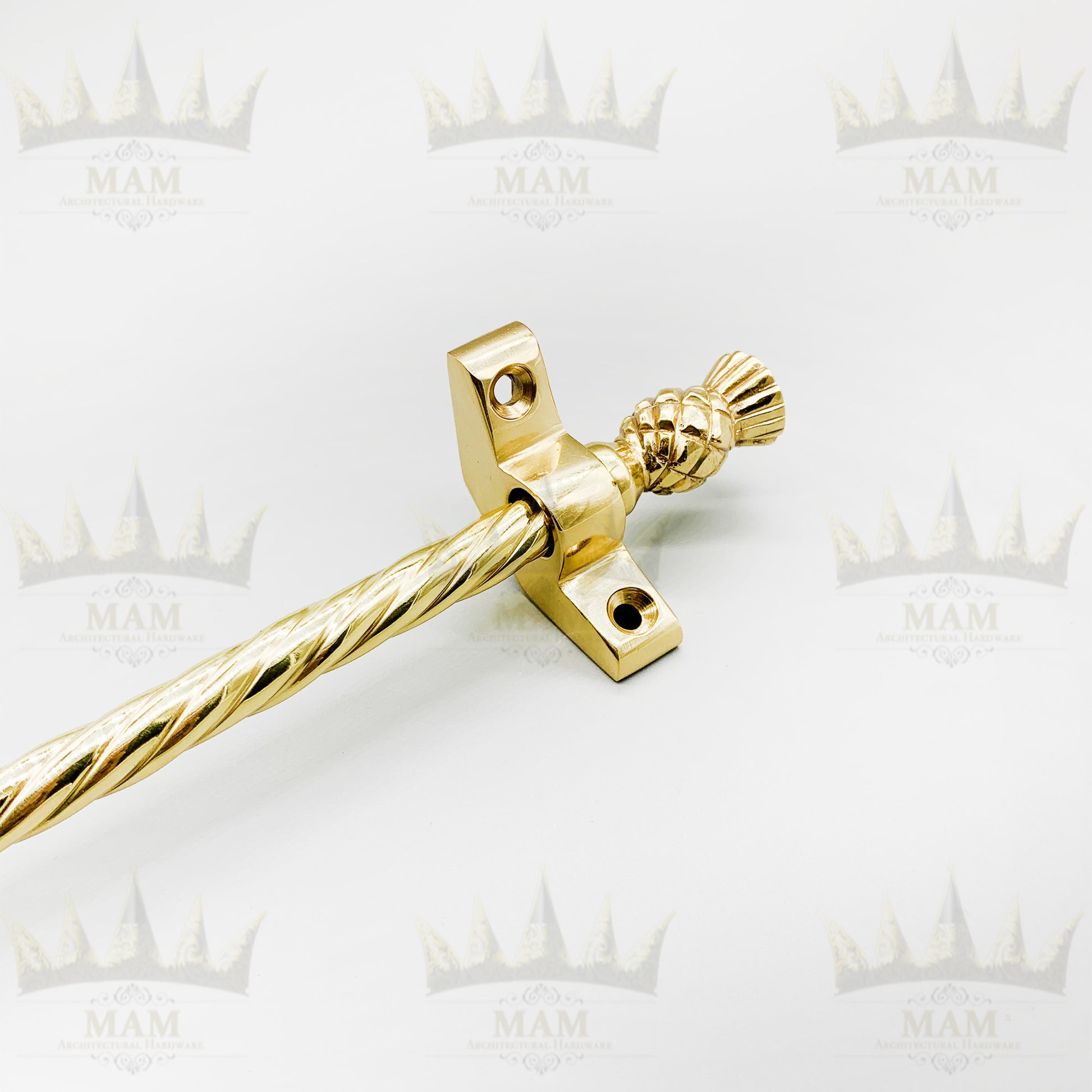 Polished Brass Stair Rods - 3/8" x 28.5" - Candy Twist - Thistle Finial