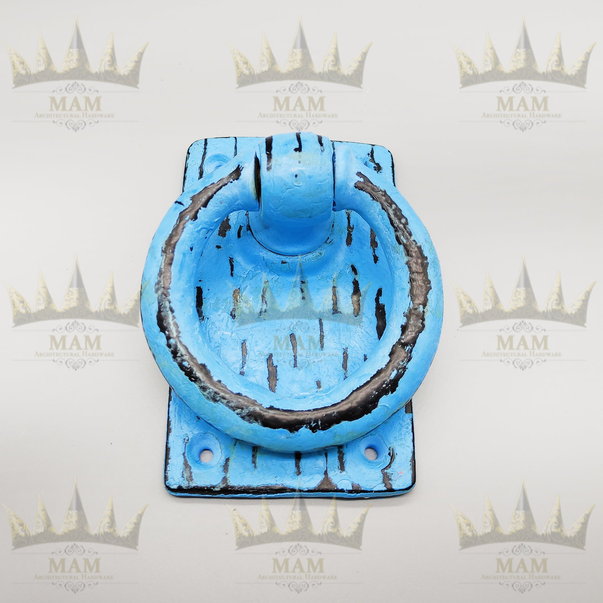 Giving your front door a simple, stunning look and your guests something unique to announce their arrival with this classic ring door knocker. It is made of sturdy and durable cast iron in a beautiful blue finish. Features a ring and ball style knocker mounted on a rectangular striker plate with four built-in mounting holes for quick and easy installation on most doors.